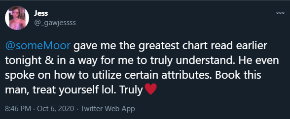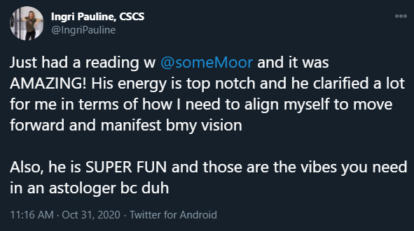 "There is no doubt that you understand the laws of the universe and manifestation so as to guide you into their own sovereignty, which is something only those whom have evolved beyond their egoic selves are capable of offering. Your interpretation of my chart was both accurate and poetic, and you created a space where I felt seen, acknowledged, and safe opening up to you.”