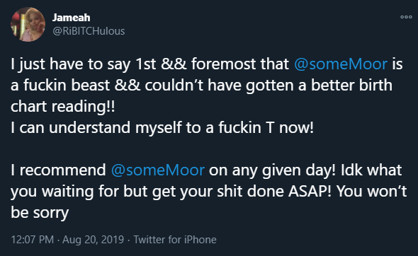 "There is no doubt that you understand the laws of the universe and manifestation so as to guide you into their own sovereignty, which is something only those whom have evolved beyond their egoic selves are capable of offering. Your interpretation of my chart was both accurate and poetic, and you created a space where I felt seen, acknowledged, and safe opening up to you.”