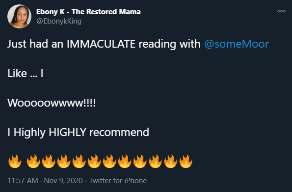 "There is no doubt that you understand the laws of the universe and manifestation so as to guide you into their own sovereignty, which is something only those whom have evolved beyond their egoic selves are capable of offering. Your interpretation of my chart was both accurate and poetic, and you created a space where I felt seen, acknowledged, and safe opening up to you.”